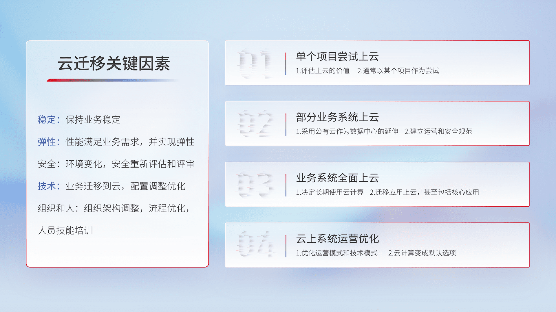 结合实际业务,,,从规划设计、、云平台选型、、、、云原生改造、、、数据迁移、、集成交付,,,,迁移全过程为客户识别最佳上云路径,,做好风险识别管理,,,设计网络架构、、、身份权限、、、、安全审计合规、、、操作审计、、日志审计、、、、监控告警策略、、、多站点容灾设计等,,,对云上基础设施进行整体规划,,,提升IT治理水平,,以满足弹性、、高可用、、高性能的需求。。。。